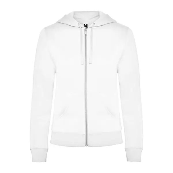 Női pulóver, a kapucniban azonos tónusú béléssel. 1.- Elöl fémcipzár. 2.- Kenguruzsebbel. 3.- A nyakon belül megerősített varrásfedő. 4.- A mandzsettákon és a derékrészen 2x2-es bordázású szövettel. 5.- Alakkiemelő szabás.
