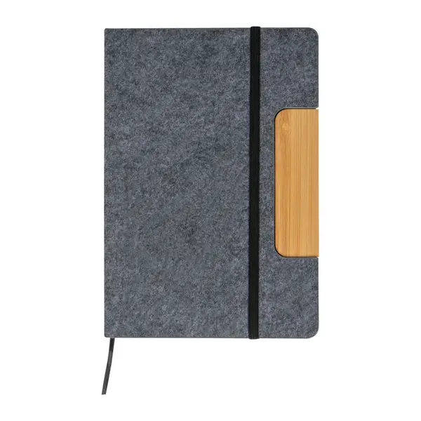 Szett, amely egy filc/bambusz borítású jegyzetfüzetből és egy bambusz golyóstollból áll, fekete ajándékdobozba csomagolva. 80 oldal vonalas újrahasznosított papírt (70 g/m²) tartalmaz, a golyóstoll kék tintával és utántöltővel van felszerelve.