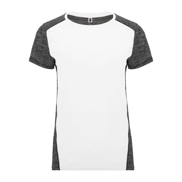Rövid ujjú, női technikai póló. 1. Kerek nyak. 2. Hátul kombinált kialakítás, a vállakon és az ujján két poliészterből. 3. Elöl bird's eye fő szövet, hátul space dye szövet. 4. Hátul enyhén hosszabbra hagyott szabás.